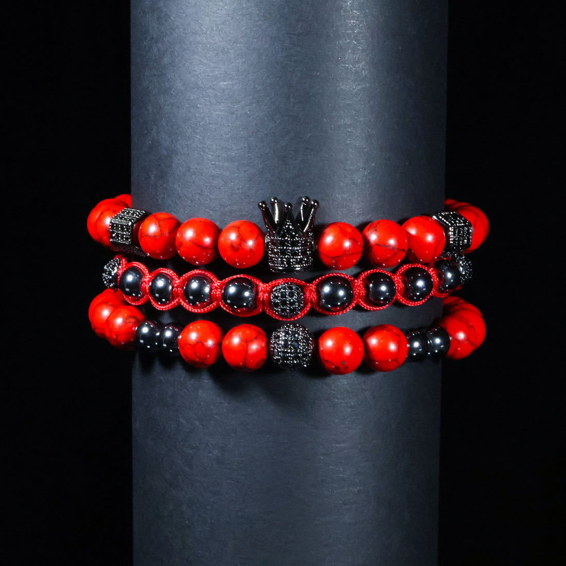 Crimson Royal Triple Bracelet Set – Red Stone & Black Crown Edition