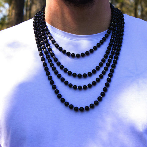 From top to bottom, the necklaces in the photo show these common lengths (our model is 6ft / 1.84m tall):