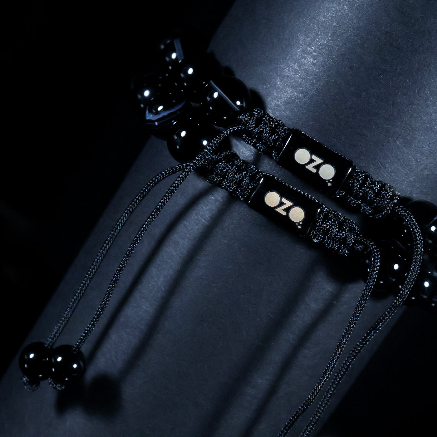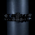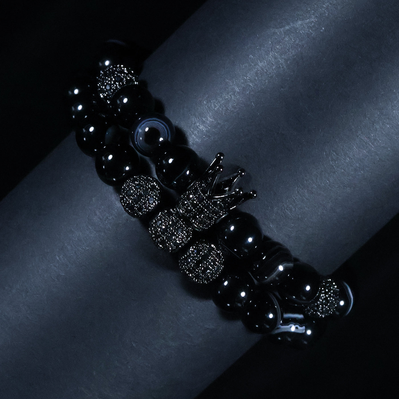 Crafted with high-polish black onyx beads, this bracelet is accented by a striking black crown centerpiece and textured pavé-style beads that catch light with subtle brilliance. The deep black palette symbolizes protection, focus, and authority, while the crown represents leadership and self-mastery.
