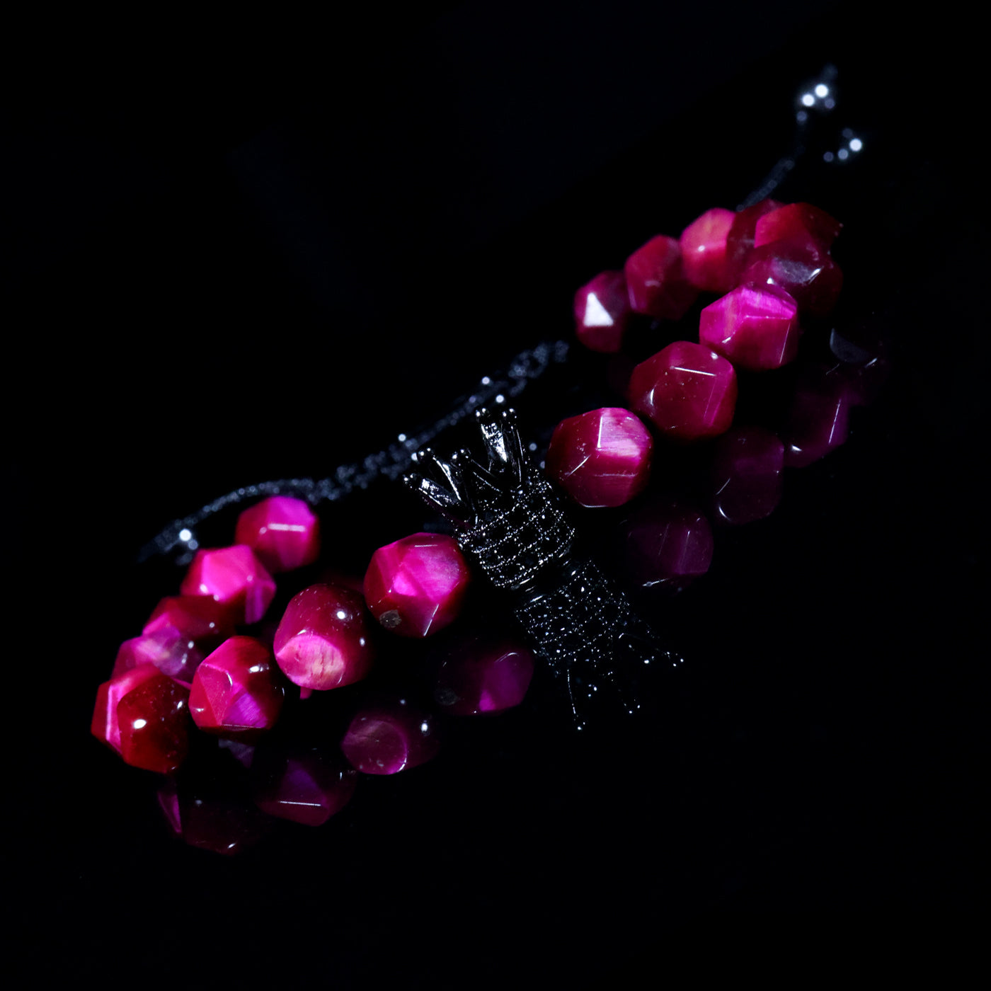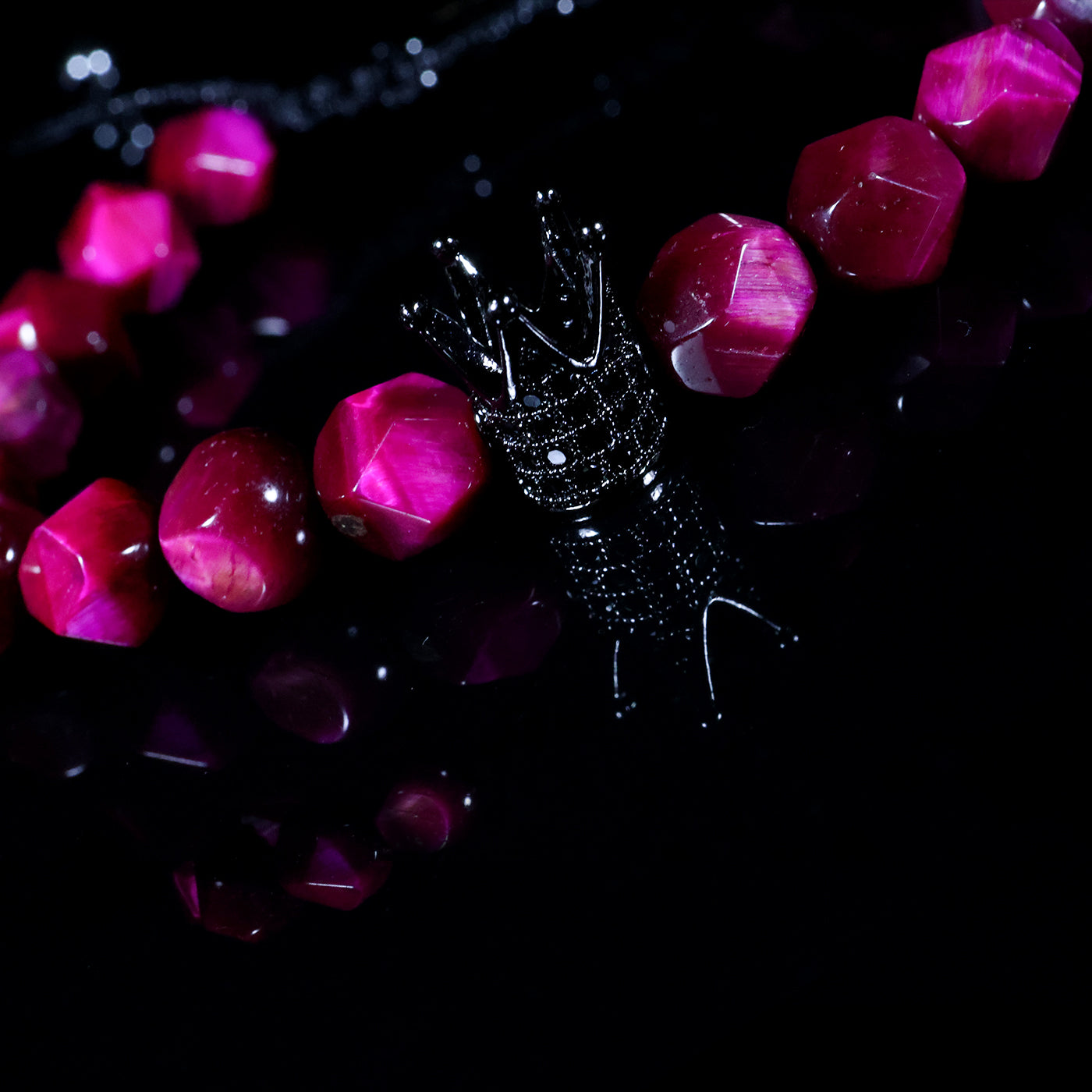 At the center, the iconic black crown charm stands as a symbol of self-worth, leadership, and inner strength. The contrast between the vibrant pink stones and the dark crown delivers a statement that is both fearless and sophisticated.