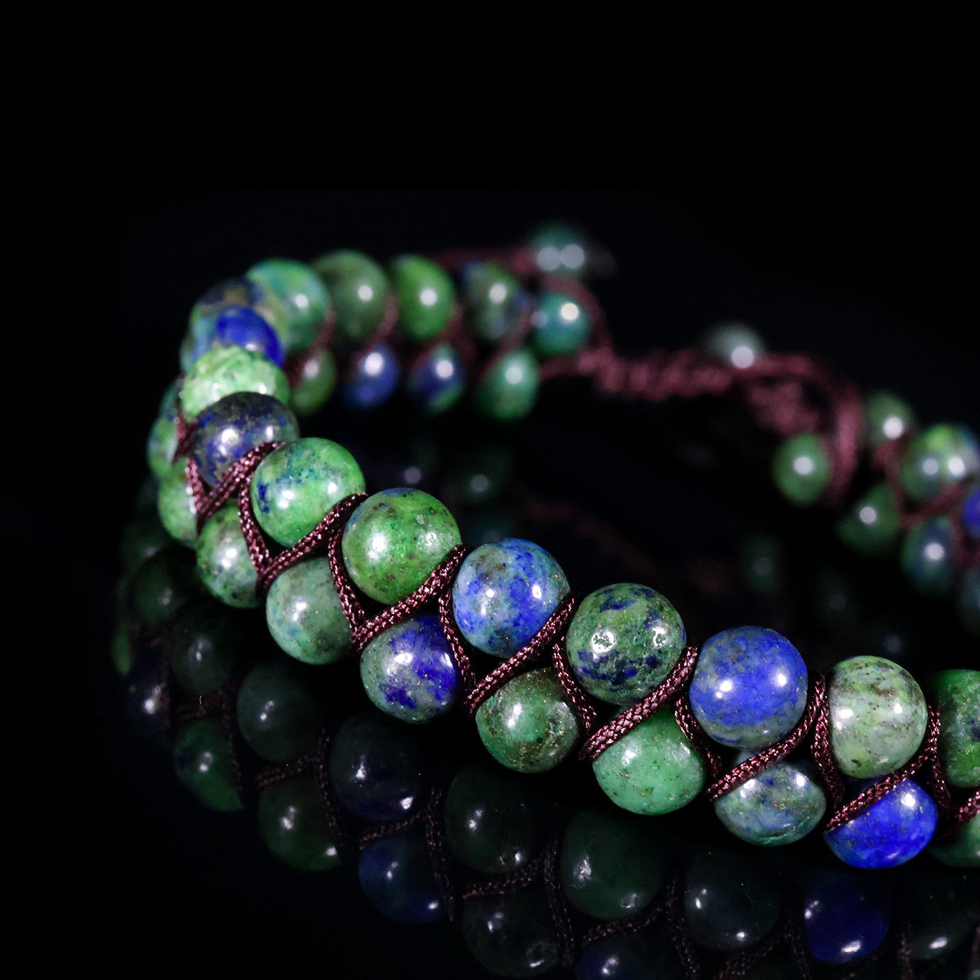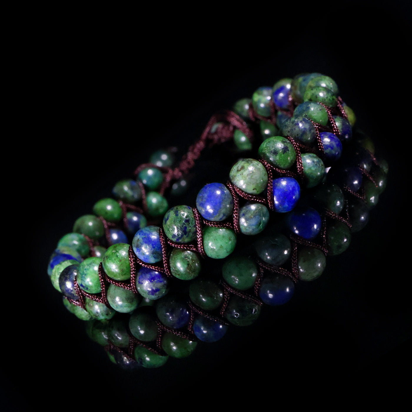 The Emerald Azure Macramé Bracelet brings together the grounding richness of deep green stones with flashes of vibrant blue, creating a design inspired by nature’s balance and inner strength. Each polished bead reveals unique organic patterns, making every bracelet unmistakably one of a kind.