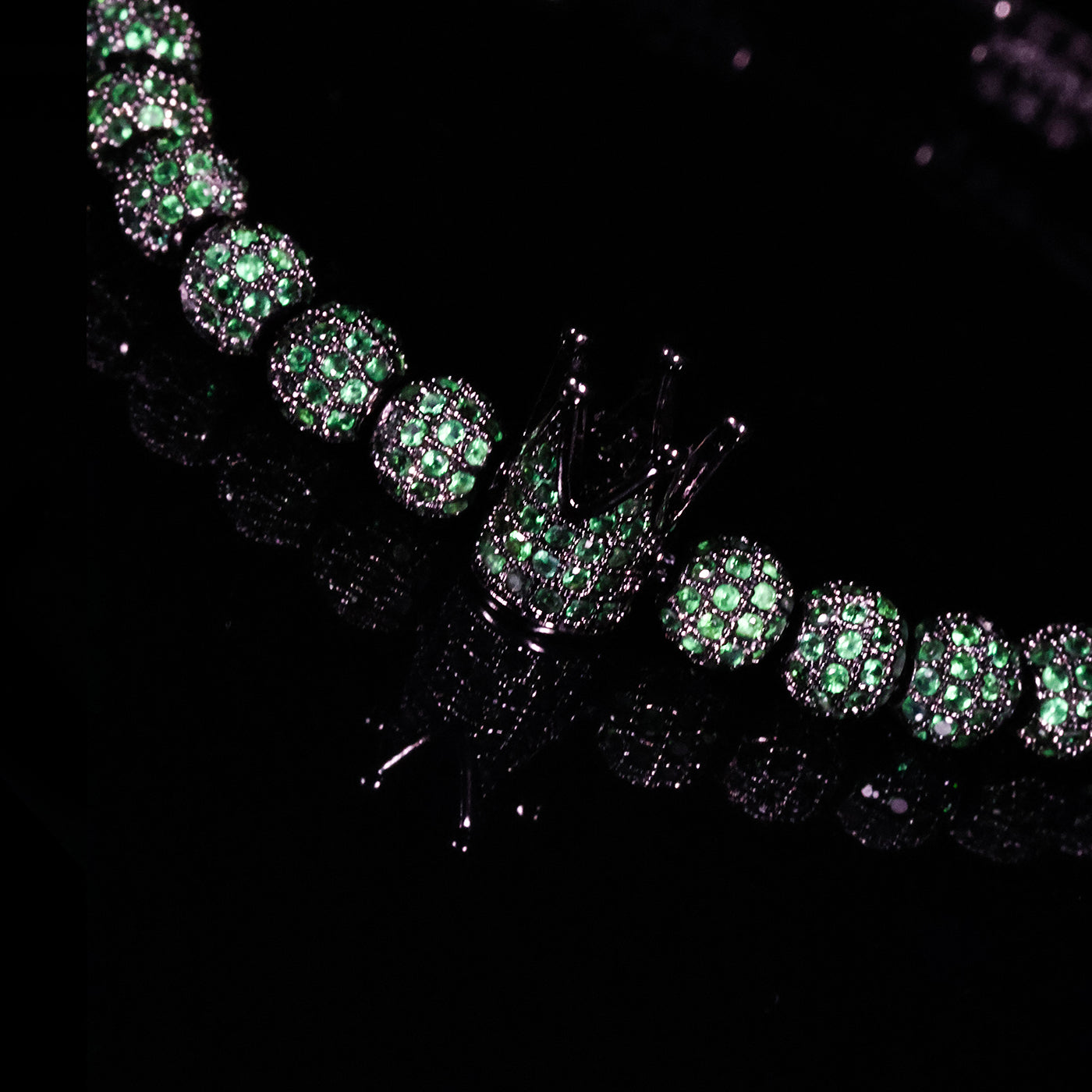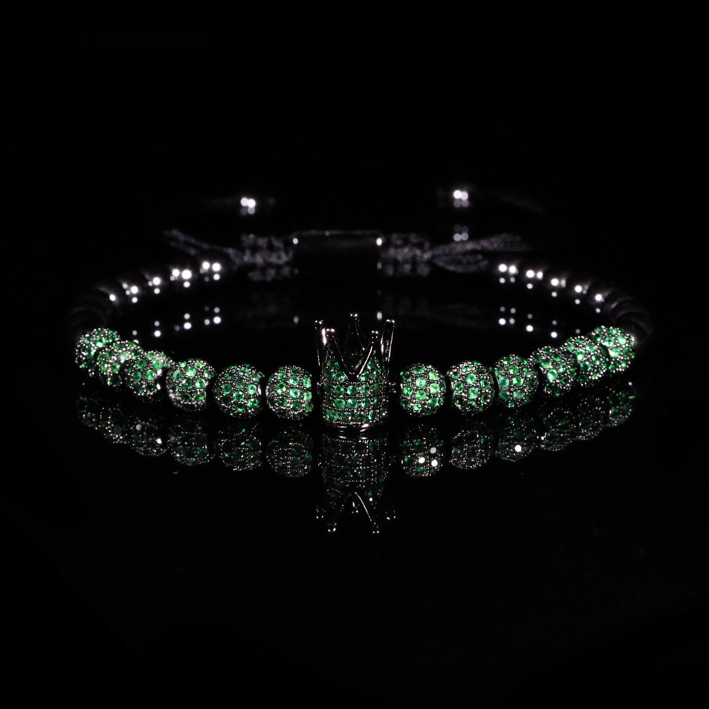 Command attention with the Emerald Crown Bracelet, a refined fusion of bold elegance and modern luxury. Designed for men who carry presence and confidence, this bracelet features radiant emerald-green micro-pave stones set across perfectly polished beads, creating a striking glow against the deep black finish.