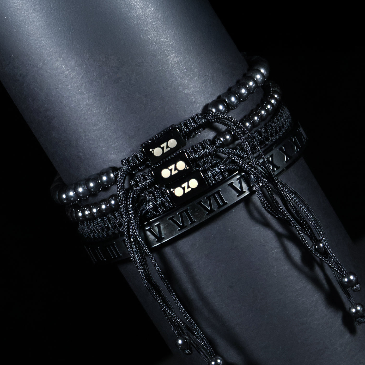 This multi-layered set features a combination of textured beads, geometric stone-inlaid cubes, a sleek bar bracelet, and a matte black Roman numeral bangle. Together, they form a refined and stylish stack that elevates any outfit—from streetwear to high-end formal attire.