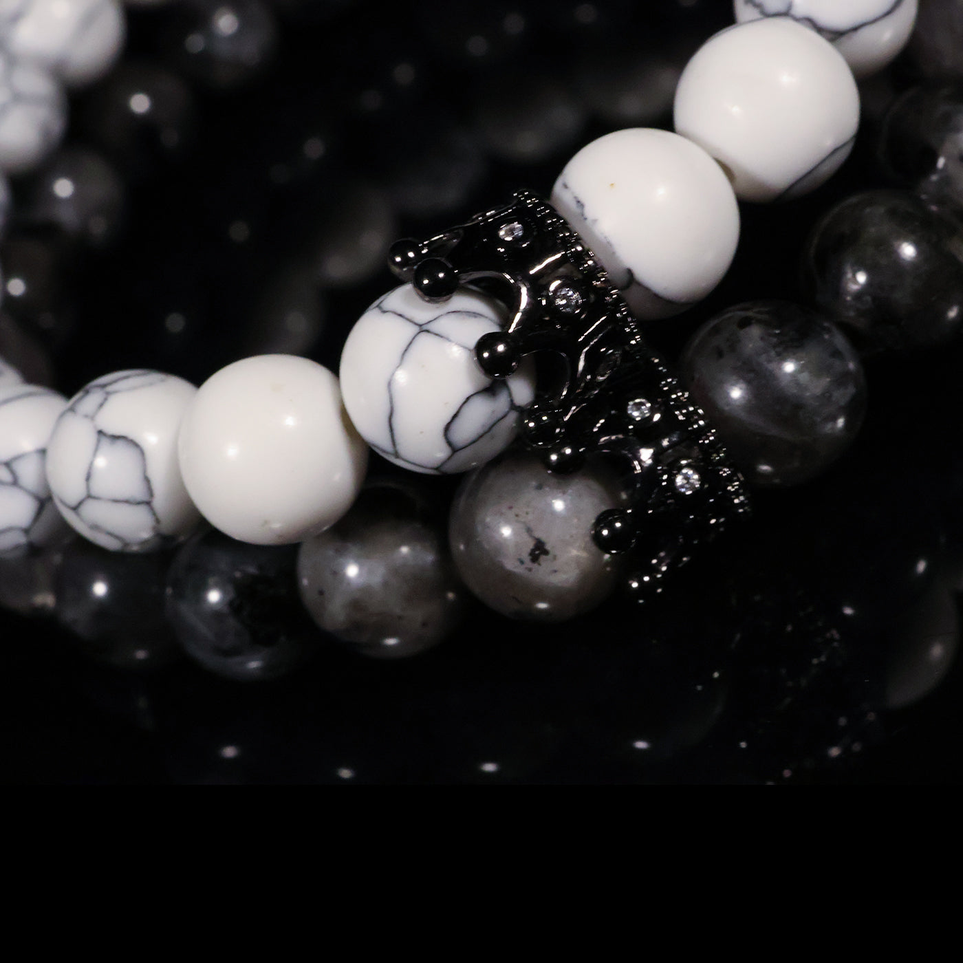 Each bracelet features high-quality polished beads paired with a black-metal crown centerpiece, symbolizing confidence, power, and refined taste. The natural marbling of the white beads and the depth of the grey stones make this duo visually unique, modern, and effortlessly stylish.