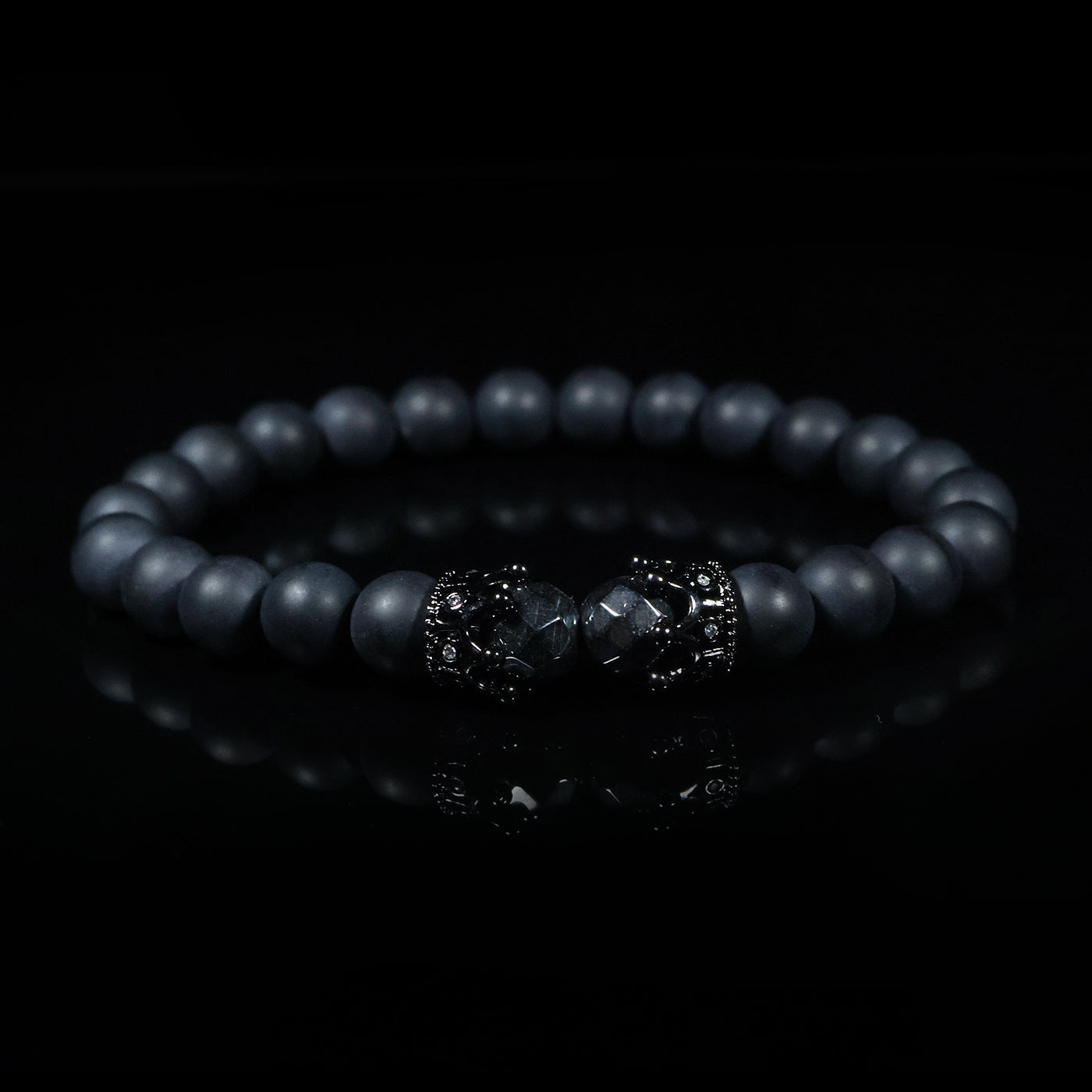 Crafted with smooth matte black beads, this bracelet delivers a clean, contemporary look with a soft, velvety finish. At its center, two glossy black accent beads with intricate detailing add a refined contrast—catching light quietly without overpowering the design.
