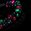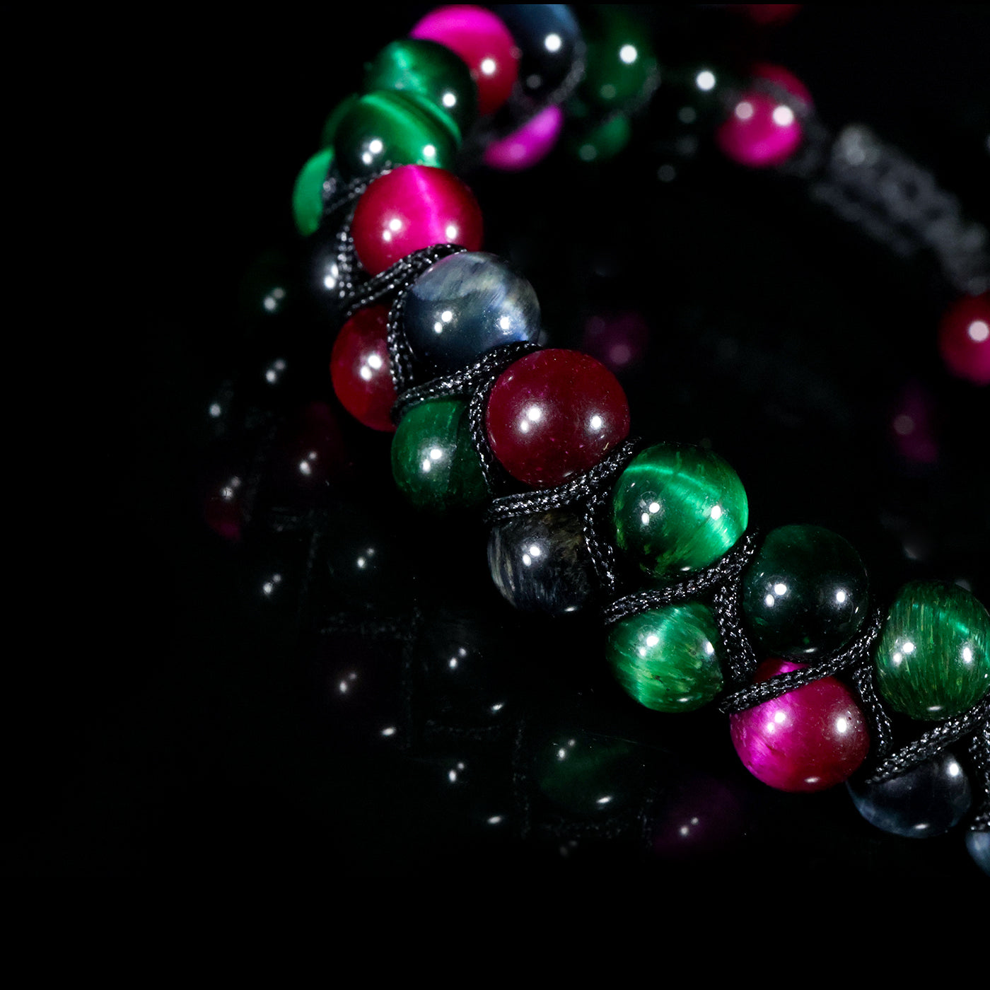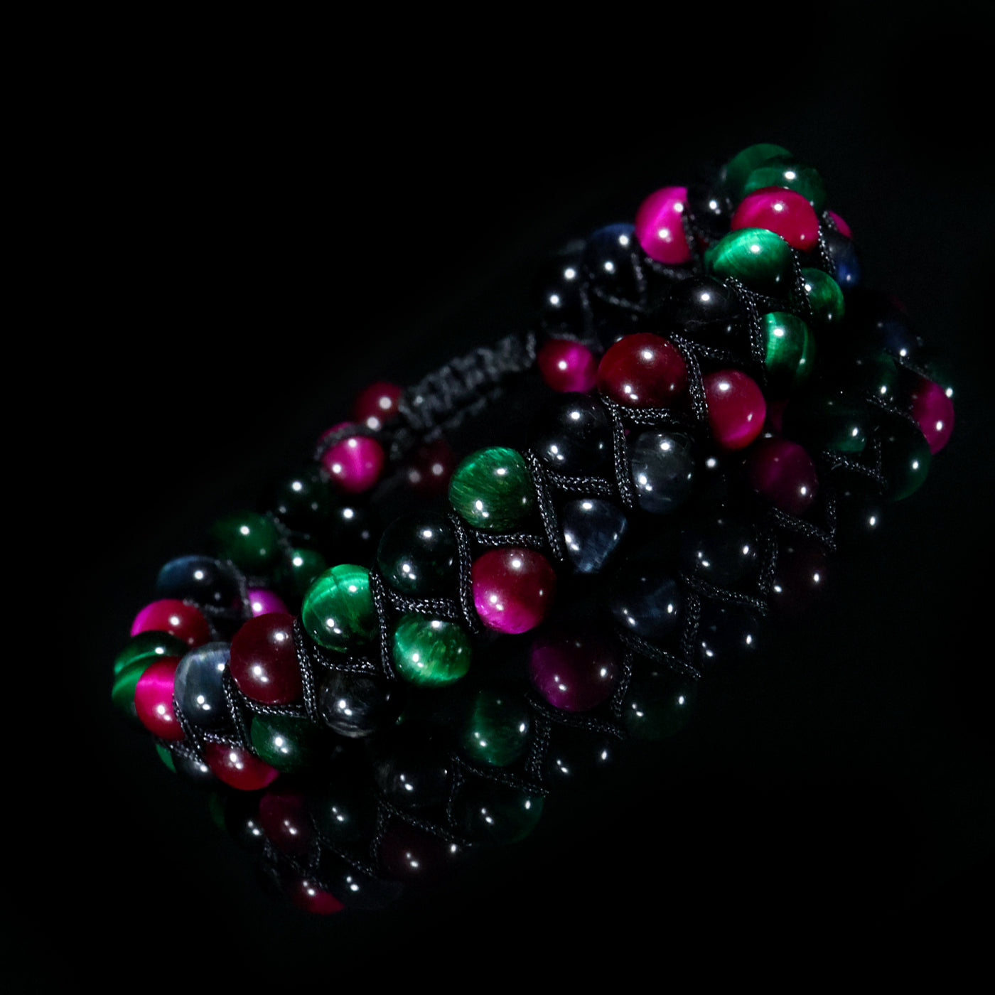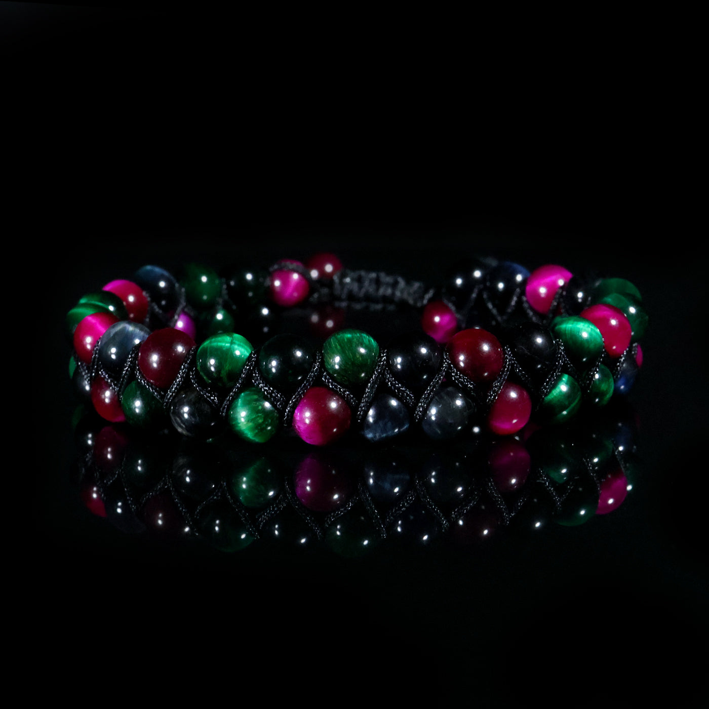 The Midnight Spectrum Macramé Bracelet is a striking fusion of rich natural stones set against a dark, handwoven macramé base. Vivid hues of emerald green, deep crimson, electric pink, and midnight black come together to create a powerful, high-contrast design that stands out effortlessly.