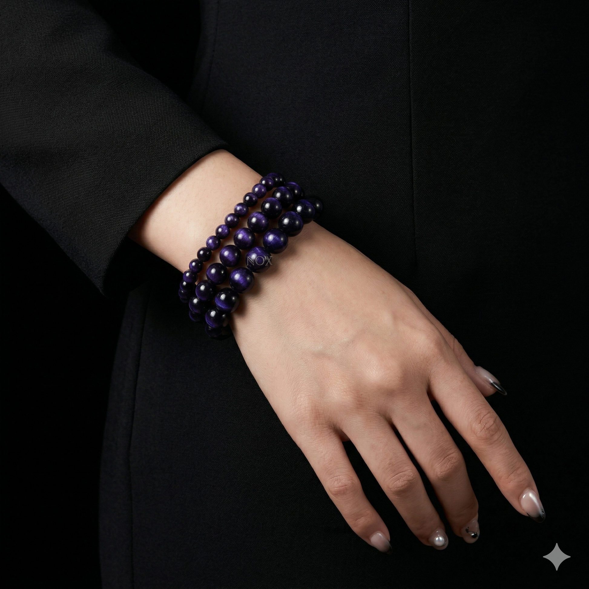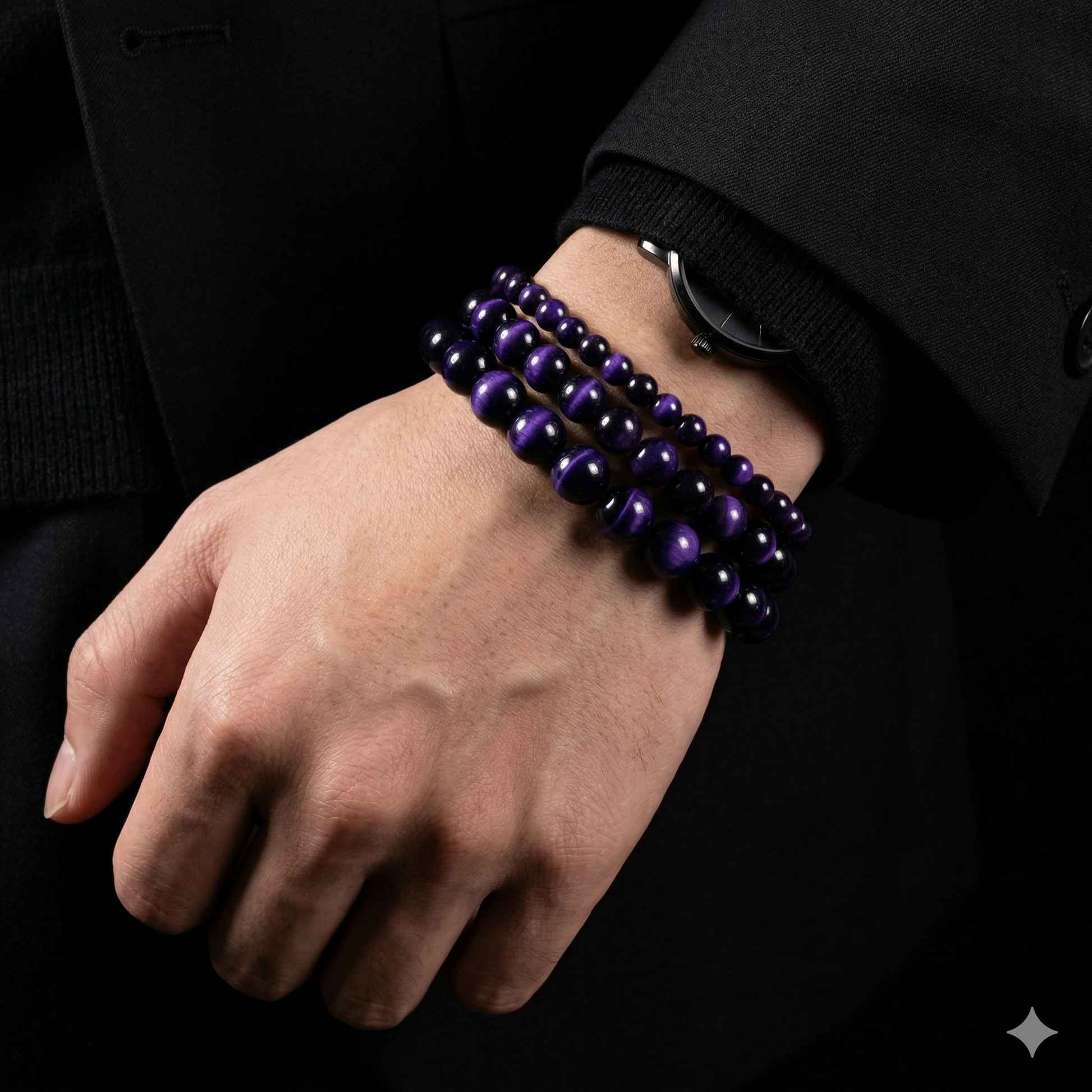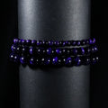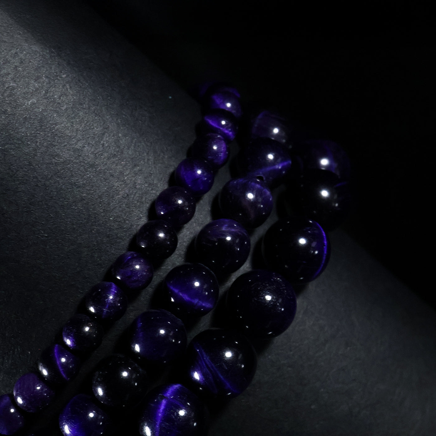 Crafted from rich dark stones infused with subtle violet highlights, each bead reveals a hidden glow when it catches the light. The interplay between deep black and electric purple creates a striking contrast—bold yet sophisticated.