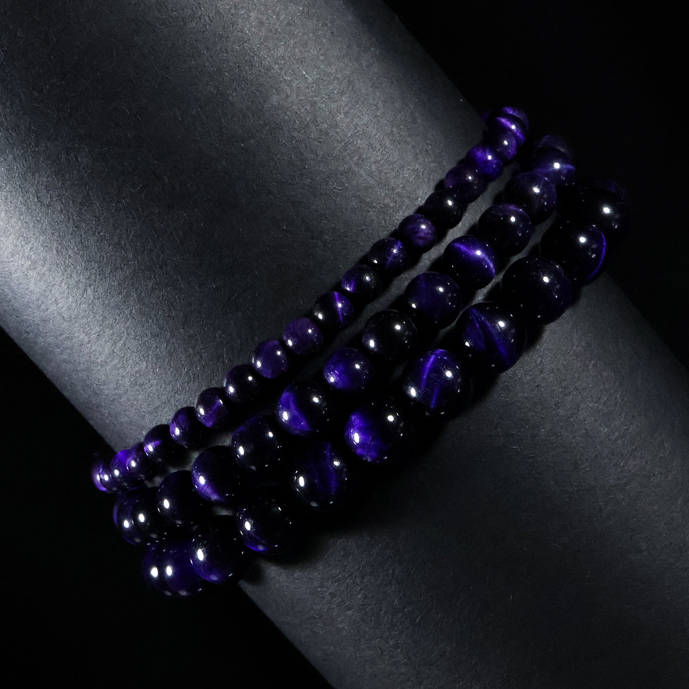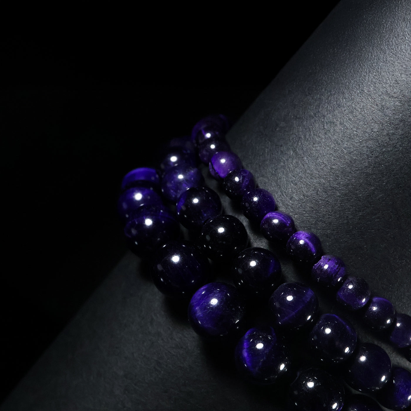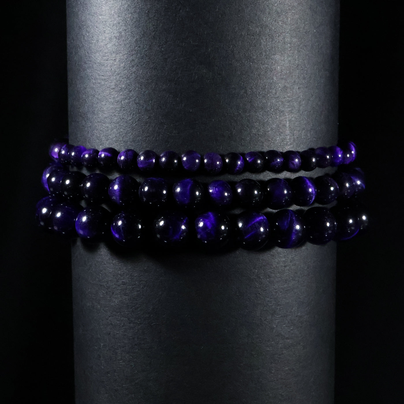 Crafted from rich dark stones infused with subtle violet highlights, each bead reveals a hidden glow when it catches the light. The interplay between deep black and electric purple creates a striking contrast—bold yet sophisticated.