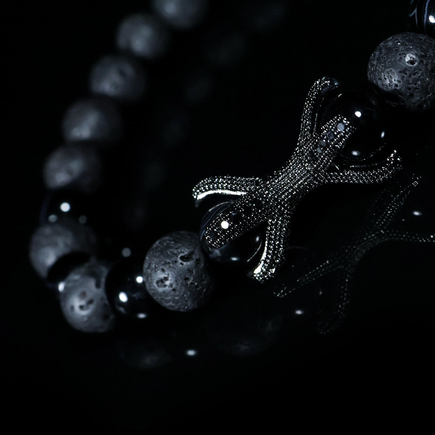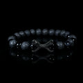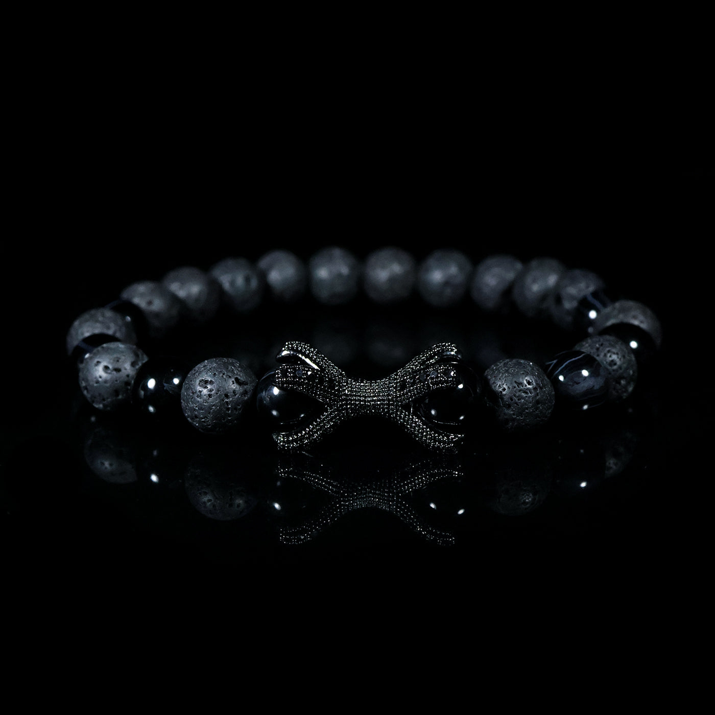 Featuring textured volcanic stone beads paired with high-gloss black accents, this bracelet creates a striking contrast between raw nature and polished elegance. At the center, a sculpted black knot centerpiece, detailed with micro-textured metalwork, represents unity, resilience, and control.