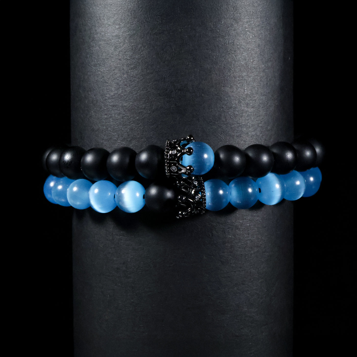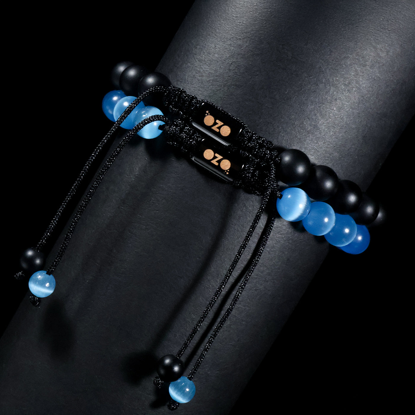 Designed for balance, clarity, and modern strength, the OZO Crown Blue Cat’s Eye Double Bracelet blends calm energy with bold character. This refined double-layer design features deep matte Black Onyx beads paired with luminous Blue Cat’s Eye stones, creating a striking contrast of power and serenity.