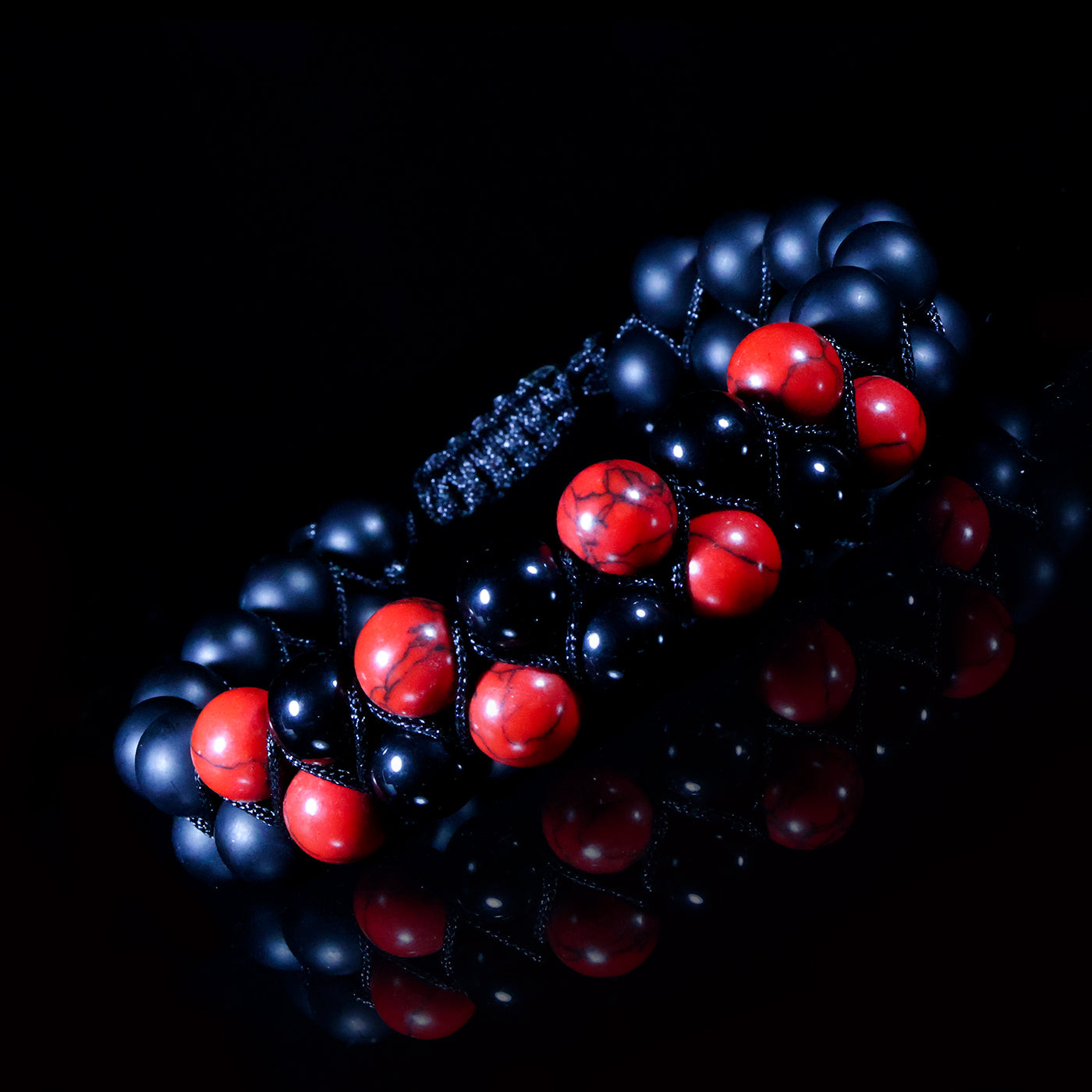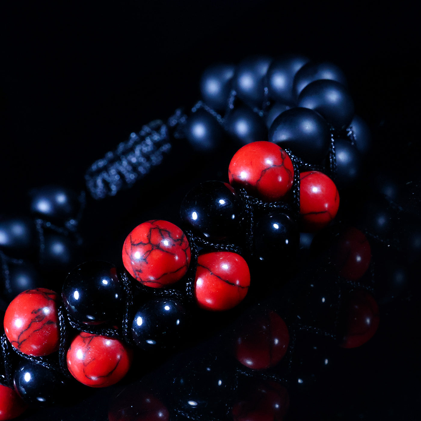 Dual-Stone Design: Vibrant red stones paired with sleek matte black beads
