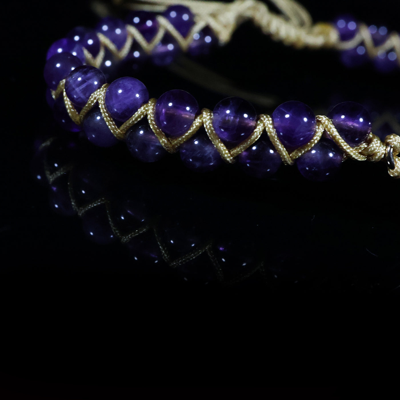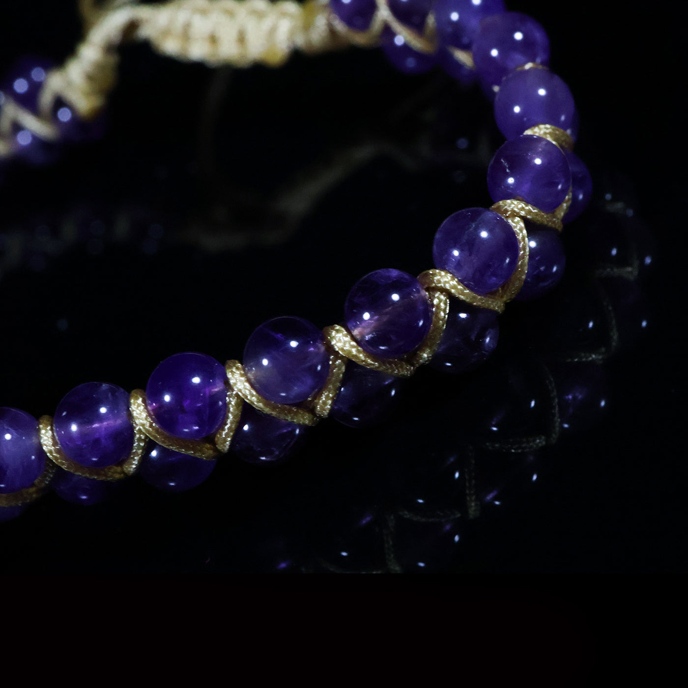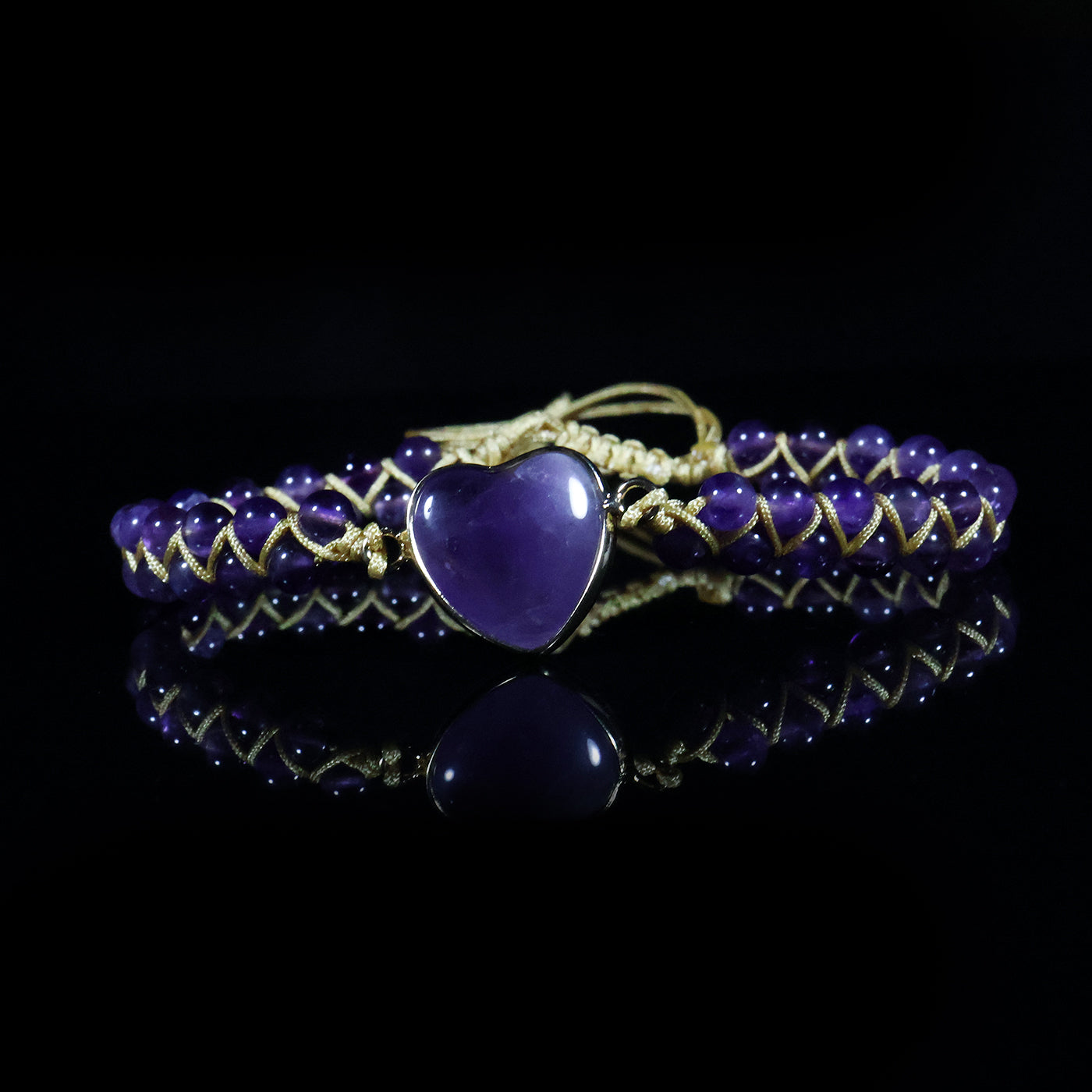 Graceful and deeply feminine, the Royal Amethyst Heart Bracelet is designed for women who appreciate elegance with meaning. At its center lies a smooth, heart-shaped amethyst stone in a rich royal purple tone—symbolizing calmness, intuition, and inner strength. The bracelet is beautifully handwoven with glossy amethyst beads and soft gold cord, creating a luxurious yet delicate look.