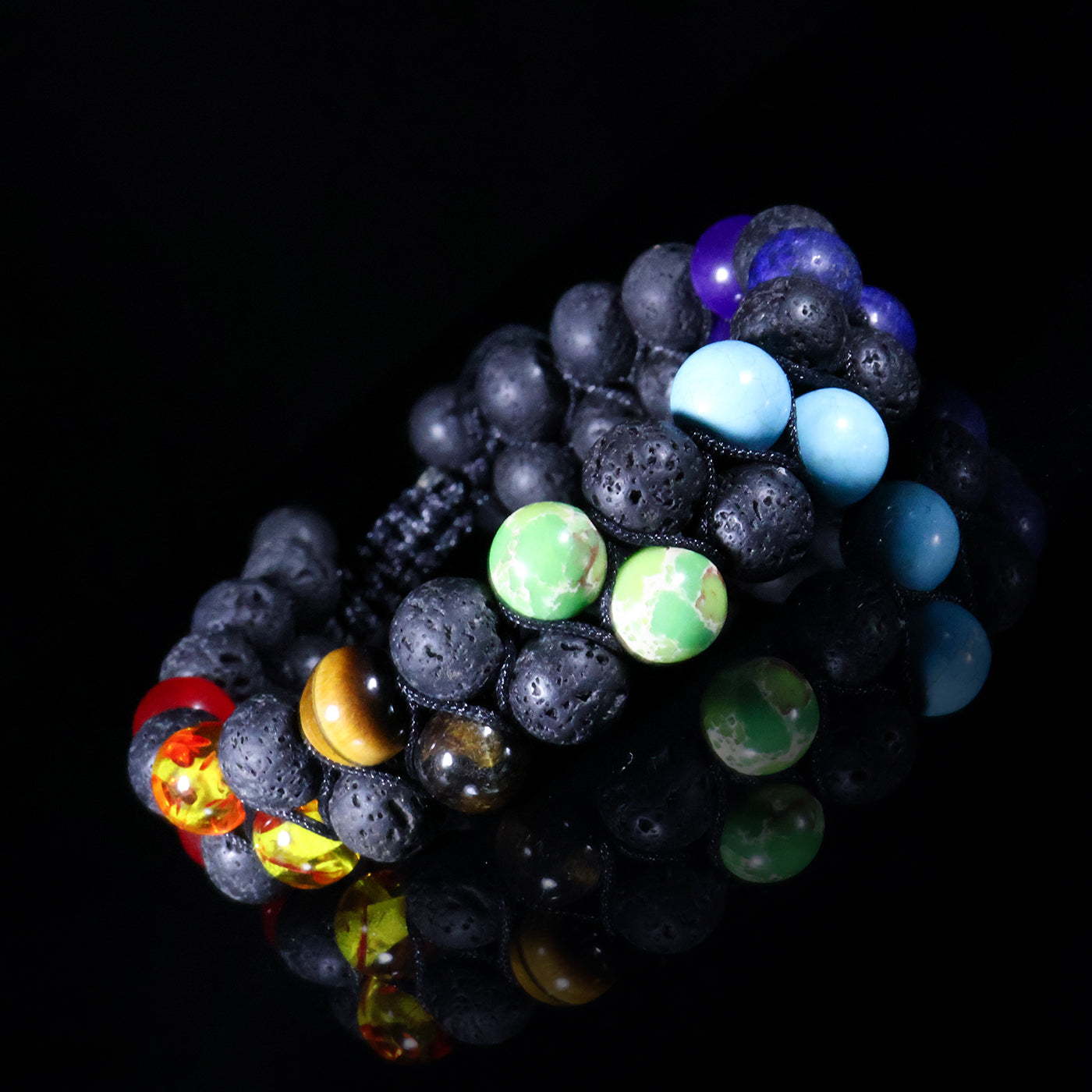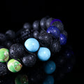 The natural lava stones offer a rugged, earthy texture and are known for their grounding properties—helping stabilize emotions, reduce stress, and promote inner strength. The seven colored stones add a vibrant, meaningful touch, symbolizing balance, clarity, and spiritual alignment.